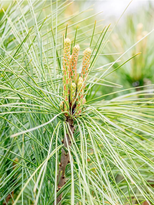 Die Kleine Tränenkiefer 'Densa Hill' ist immergrün. Ihre Nadeln sind blau-grün.