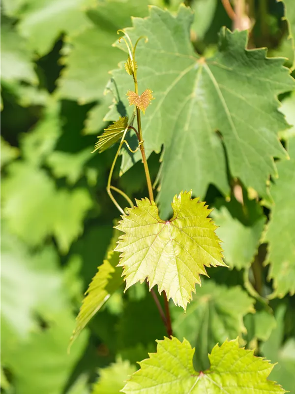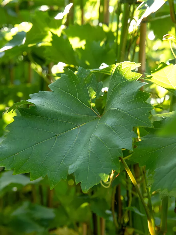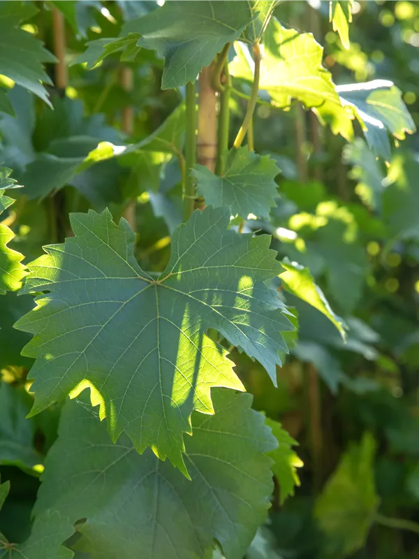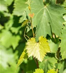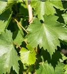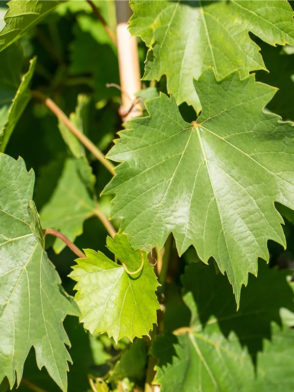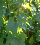 Die sommergrünen Blätter der Weintraube 'Bianca' sind dunkelgrün, herzförmig, gezähnt. Weintraube 'Bianca' zeigt sich leuchtend kupfergelb bis rot im Herbst.