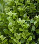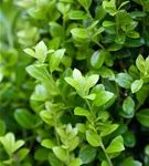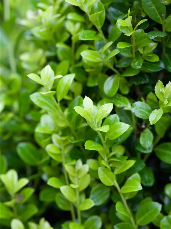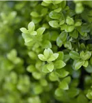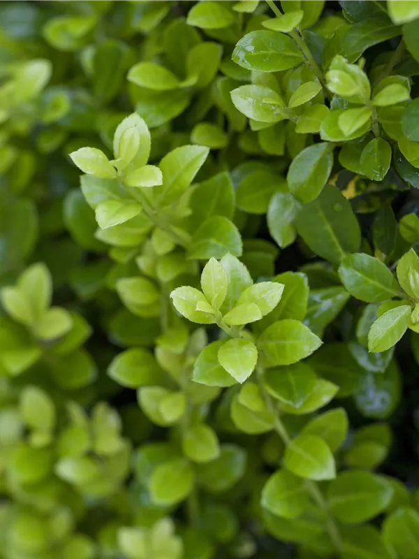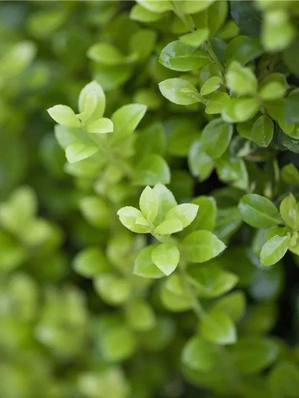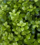 Die immergrünen Blätter des Berg-Ilexes 'Golden Rock' sind gelb, rundlich, wechselständig. Diese sind etwa 2 - 3 cm groß.