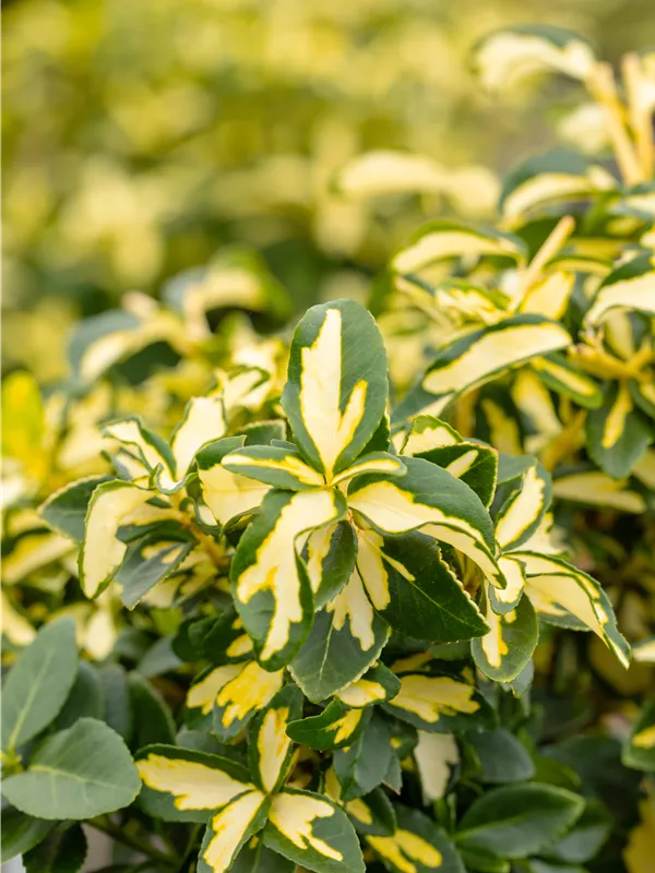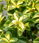 Hoher Blattschmuckwert. Die immergrünen Blätter der Kriechspindel 'Sunspot' sind gelb, eiförmig, gegenständig und weisen einen grünen Rand auf. Gelber Austrieb.