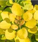 Die sommergrünen Blätter des Perückenstrauchs 'Golden Lady'® sind grüngelb, eiförmig, wechselständig. Diese sind etwa 3 - 8 cm groß. Leuchtend orangegelber Austrieb. Perückenstrauch 'Golden Lady'® zeigt sich leuchtend orange im Herbst.