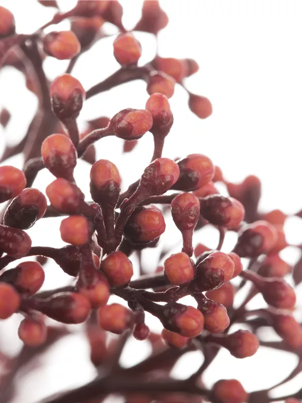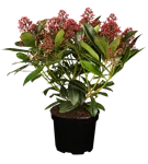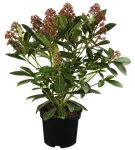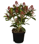 Japanische Blütenskimmie 'Rubella' ist ein buschig und kompakt wachsender Kleinstrauch. Sie erreicht gewöhnlich eine Höhe von 0,6 - 1 m und wird ca. 0,6 - 1,5 m breit. Langsam wachsend. In der Regel wächst sie 10 - 20 cm pro Jahr.