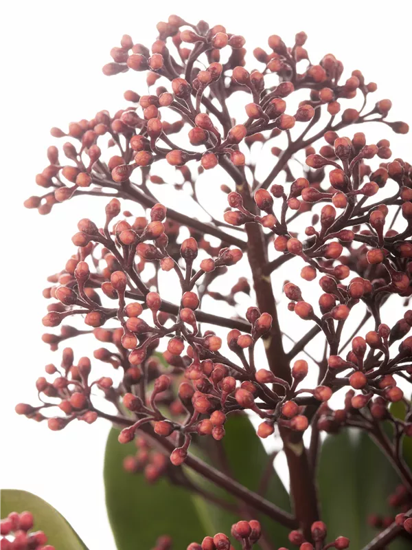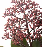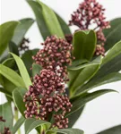 Die roten Blüten der Japanischen Blütenskimmie 'Rubella' erscheinen in Rispen von April bis Mai. Diese sind stark duftend.