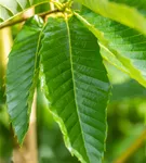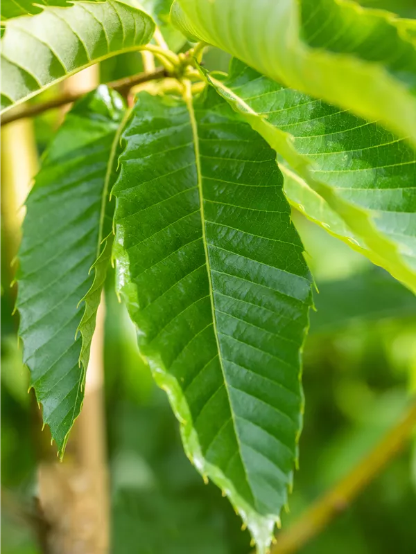 Die sommergrünen Blätter der Esskastanie 'Bouche de Bétizac' sind dunkelgrün, lanzettlich, glänzend, wechselständig, gesägt. Esskastanie 'Bouche de Bétizac' zeigt sich leuchtend goldgelb im Herbst.