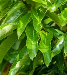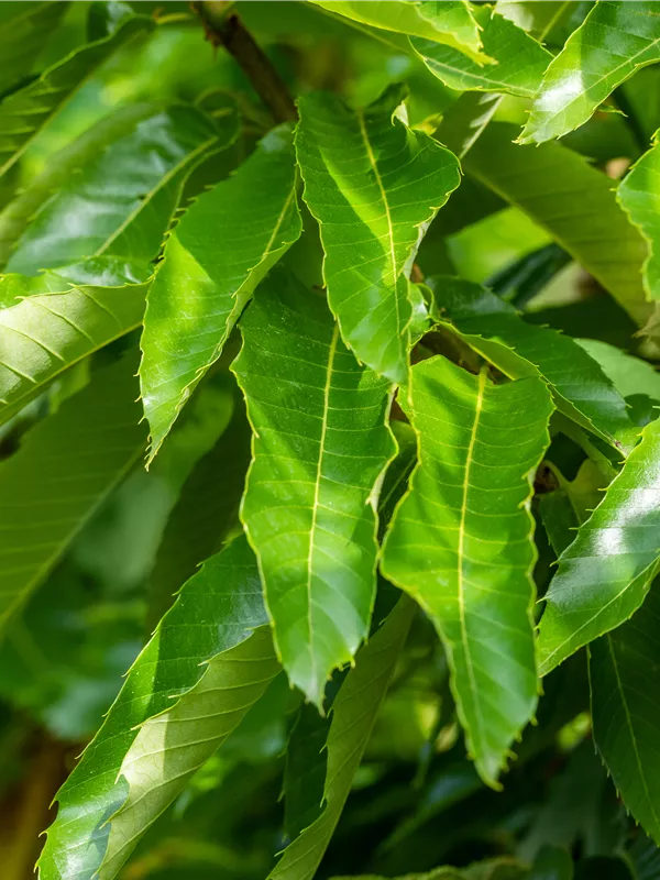 Die sommergrünen Blätter der Esskastanie 'Marigoule' sind dunkelgrün, lanzettlich, glänzend, wechselständig, gesägt. Esskastanie 'Marigoule' zeigt sich leuchtend goldgelb im Herbst.
