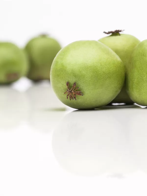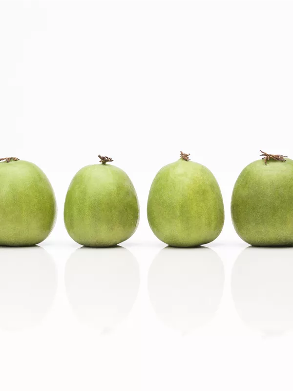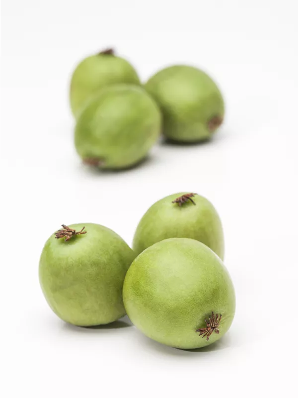Die braunen, kleinen Beeren haben einen süß-säuerlichen, exotischen Geschmack. Das grüne Fruchtfleisch dieser ovalen Beeren ist weich. Reifezeit ab August.