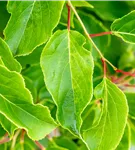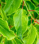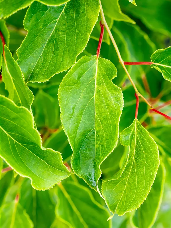 Die sommergrünen Blätter der Mini-Kiwi sind dunkelgrün, eiförmig, wechselständig, gesägt. Diese sind etwa 8 - 12 cm groß. Mini-Kiwi zeigt sich leuchtend gelb im Herbst.