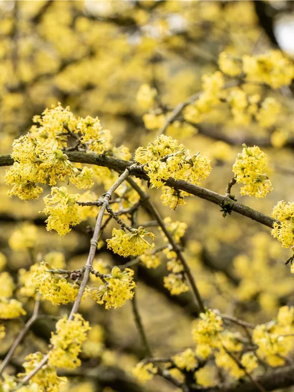 Die goldgelben Blüten der Kornelkirsche 'Big Ben'® erscheinen in Dolden von März bis April. Diese sind leicht duftend.