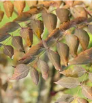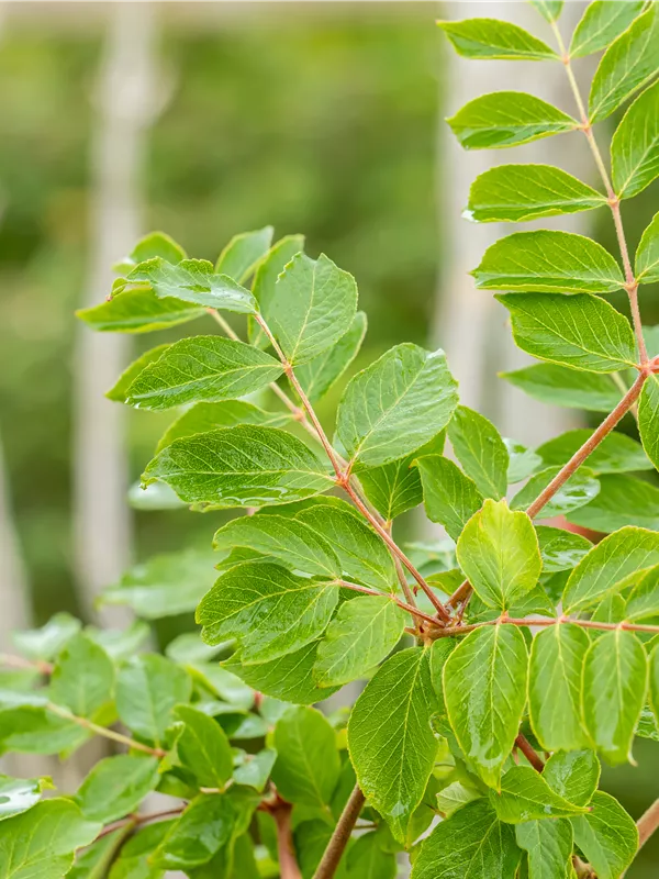 Die sommergrünen Blätter der Japanische Aralie sind dunkelgrün, gefiedert, wechselständig, ganzrandig. Japanische Aralie zeigt sich leuchtend gelb im Herbst.