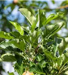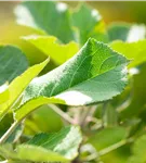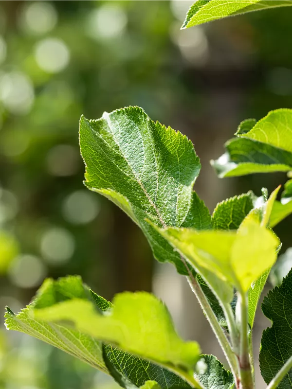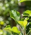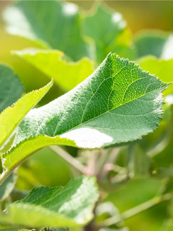 Die sommergrünen Blätter des Säulenapfels 'Rumba' sind mittelgrün, eiförmig, gesägt.