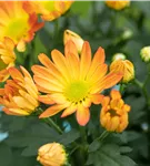 Chrysanthemum hortorum 'Kleiner Bernstein' bildet halbgefüllte, körbchenartige, strahlenförmige, bernsteingelbe Blüten ab September.
