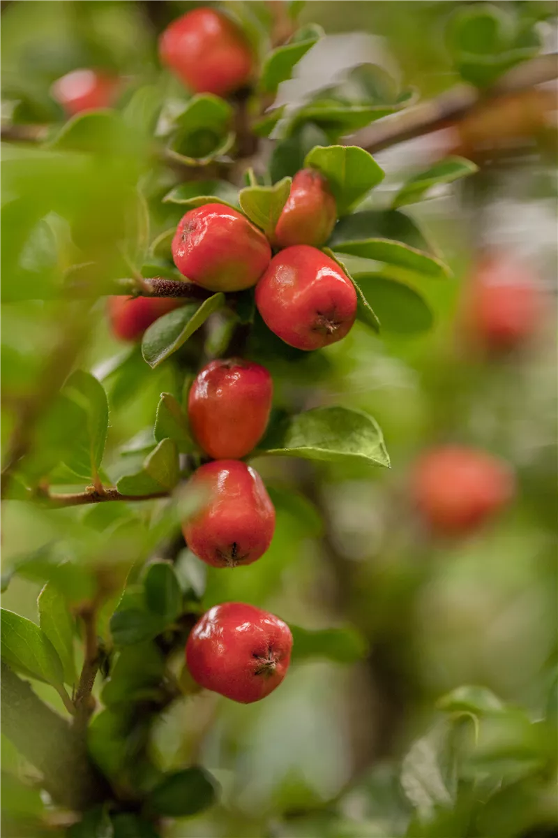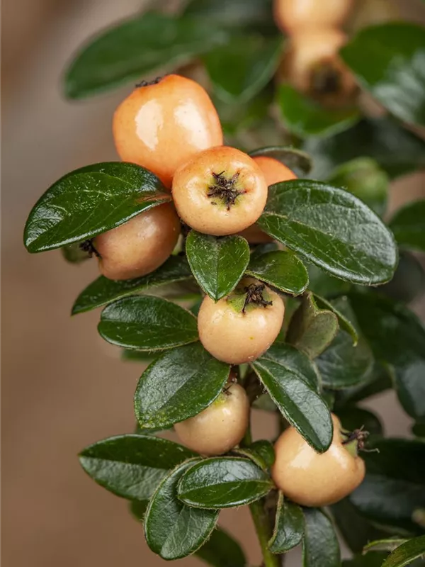 Besonders dekorativ sind die orange-roten, runden Beeren von Cotoneaster dammeri 'Coral Beauty'. Diese erscheinen ab August. Haften sehr lange.