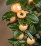 Die immergrünen Blätter der Teppichmispel 'Coral Beauty' sind dunkelgrün, rundlich, wechselständig. Teppichmispel 'Coral Beauty' zeigt sich leuchtend orangegelb im Herbst.