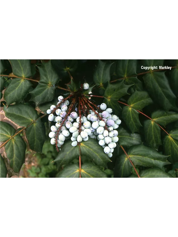 Besonders dekorativ sind die blau-grauen, runden Früchte von Mahonia bealei. Diese erscheinen ab Juli.