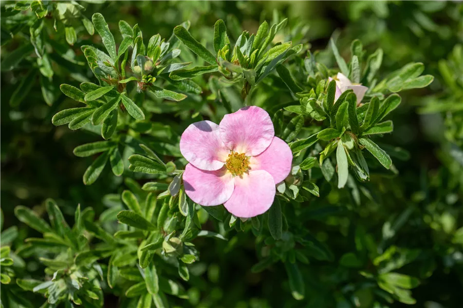 Der Fingerstrauch 'Bellissima' bildet dunkelrosafarbene Blüten von Juni bis Oktober. Die Blüten sind radförmig.