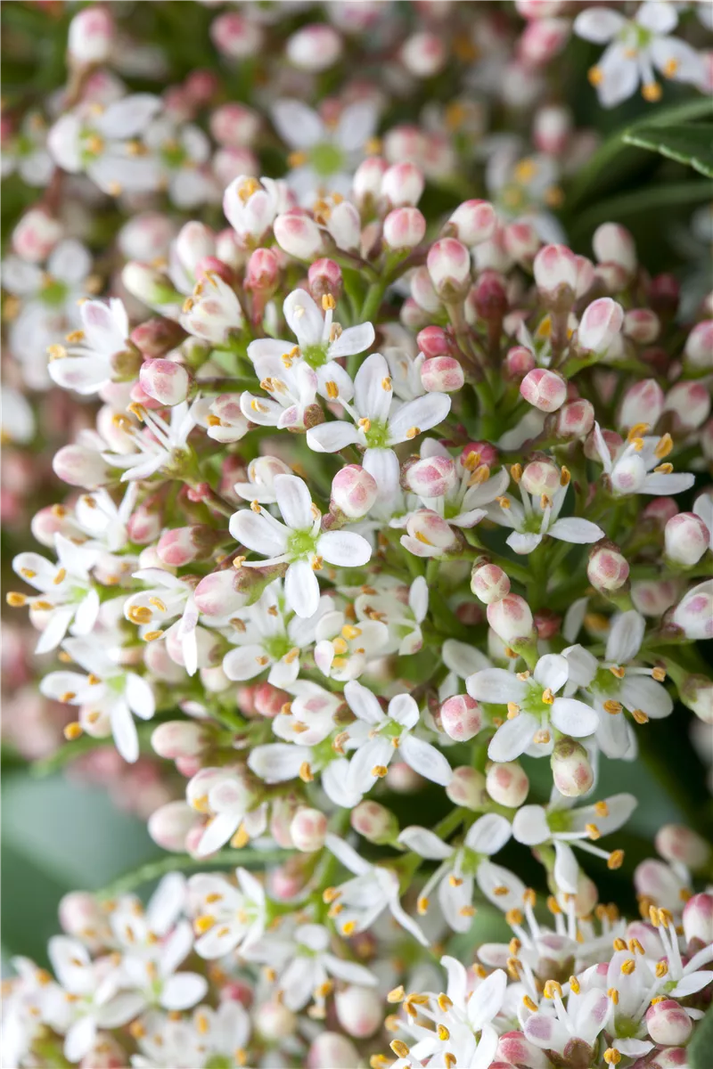 Die weißen Blüten der Japanischen Fruchtskimmie 'Fragrant Cloud' erscheinen in Rispen im Mai. Diese sind stark duftend.