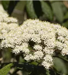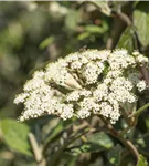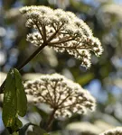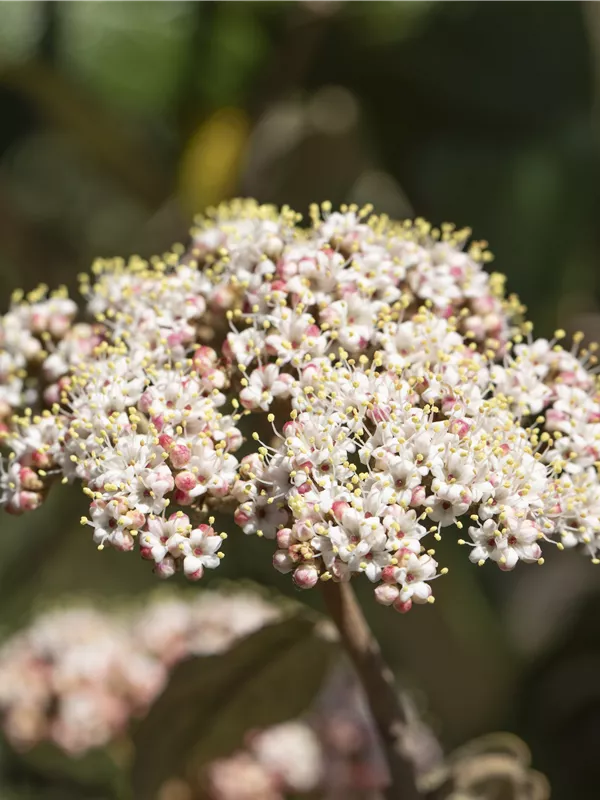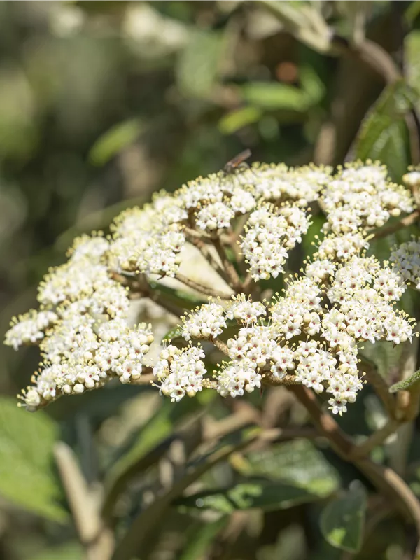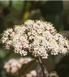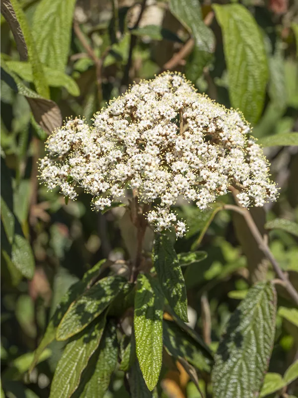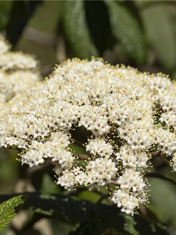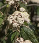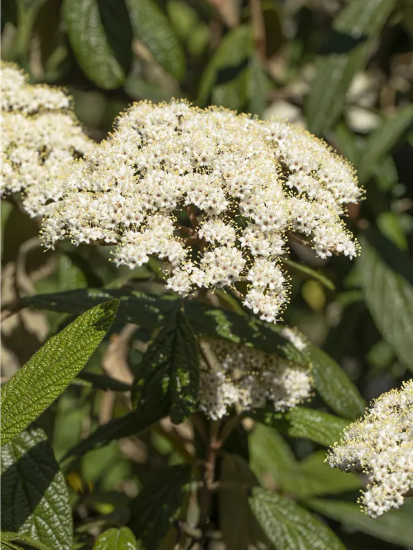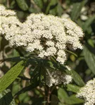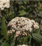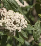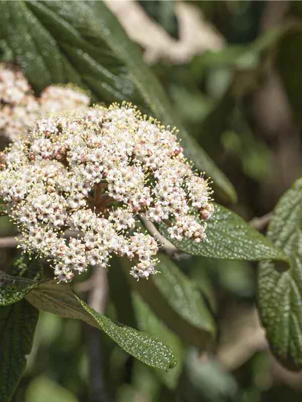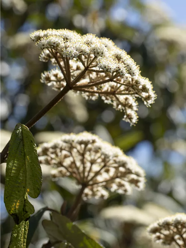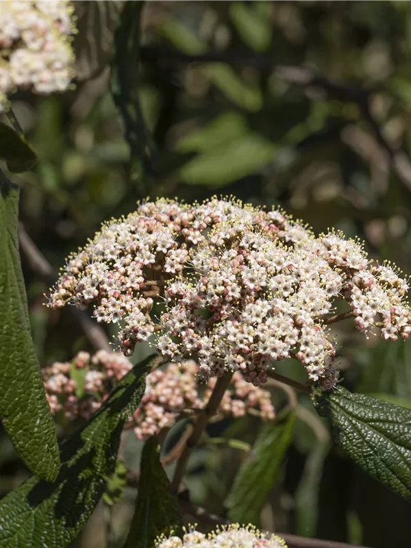 Die cremeweißen Blüten des Zungen-Schneeball erscheinen in Schirmtrauben von Mai bis Juni. Diese sind angenehm duftend.