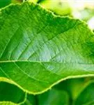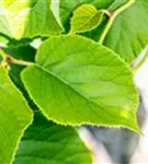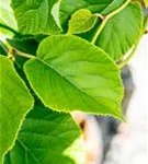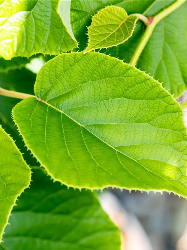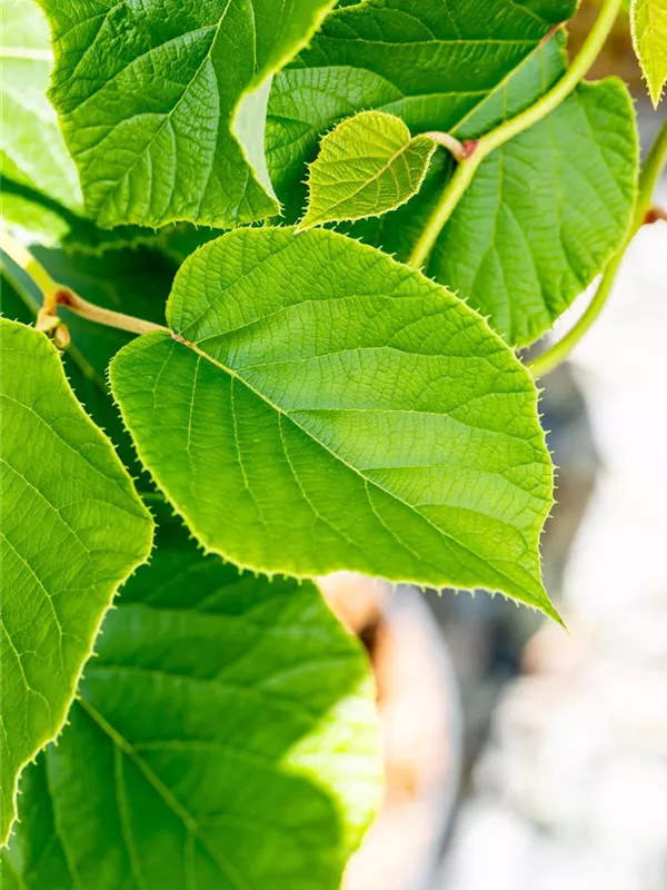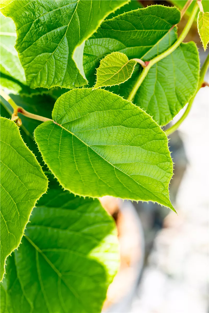 Die sommergrünen Blätter der Kiwi 'Jenny' sind dunkelgrün, rundlich, wechselständig. Diese sind etwa 10 - 15 cm groß.