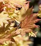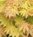 Hoher Blattschmuckwert. Die sommergrünen Blätter des Japanischen Goldahorns 'Autumn Moon' sind gelb-grün, gefingert. Hellgelber Austrieb. Japanischer Goldahorn 'Autumn Moon' zeigt sich leuchtend gelb-rot im Herbst.