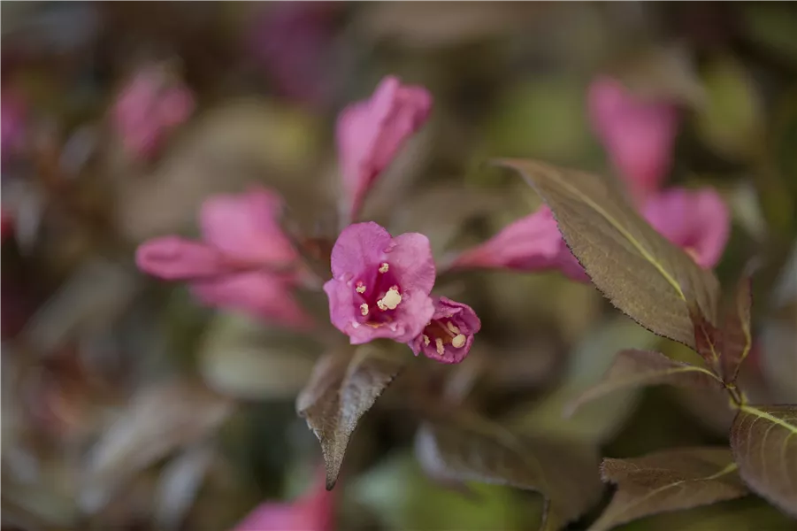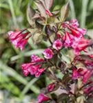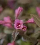 Die Weigelie 'Minor Black'® bildet rosafarbene Blüten von Mai bis Juni.