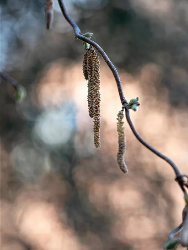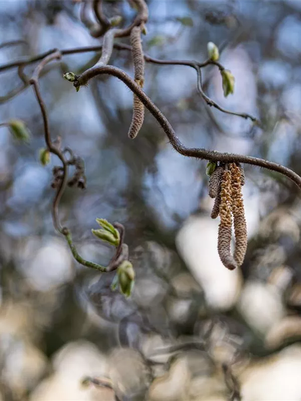 Die gelben Blüten der Korkenzieher-Hasel 'Contorta' erscheinen in Kätzchen von Februar bis März.