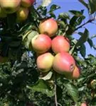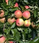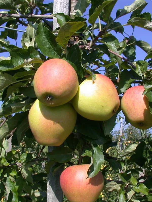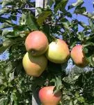 Apfel 'Pinova'(s) ist ein aufrecht, breit und buschig wachsender Kleinbaum. Er erreicht gewöhnlich eine Höhe von 3 - 4 m und wird ca. 2 - 3 m breit. In der Regel wächst er 20 - 40 cm pro Jahr.