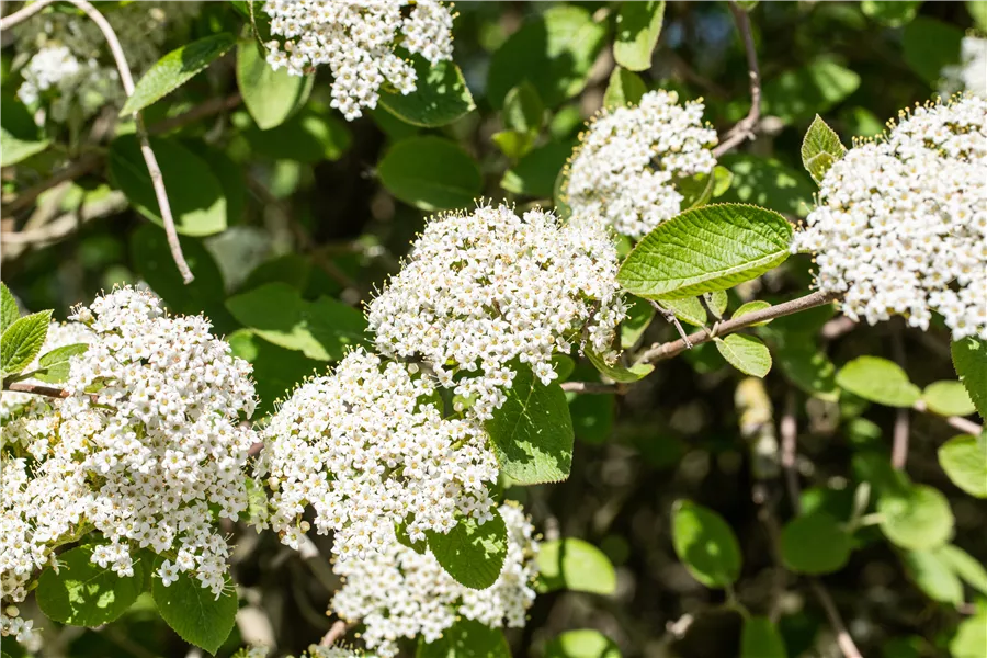 Die cremeweißen Blüten des Wolligen Schneeball erscheinen in Schirmtrauben im Mai. Diese sind leicht duftend.