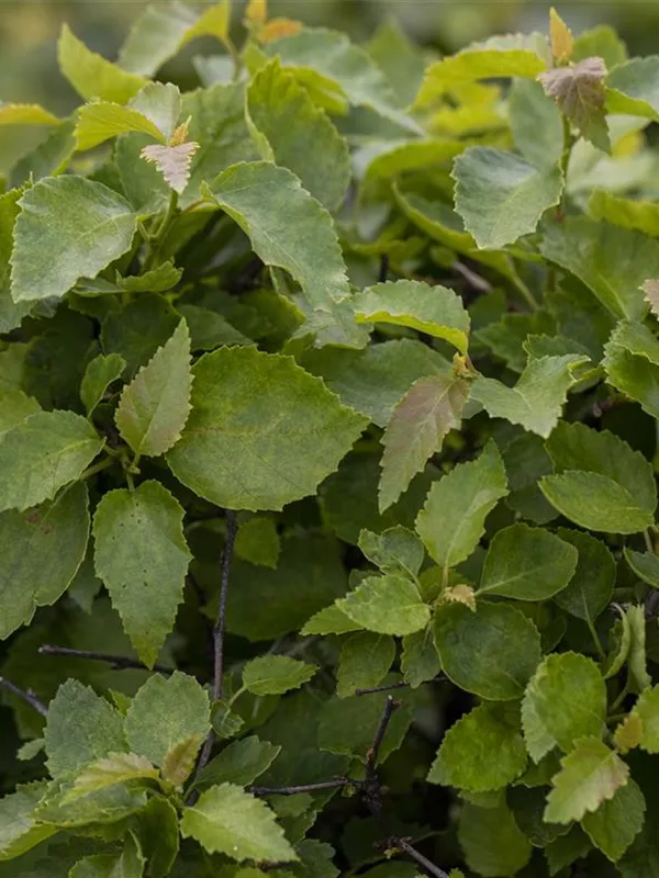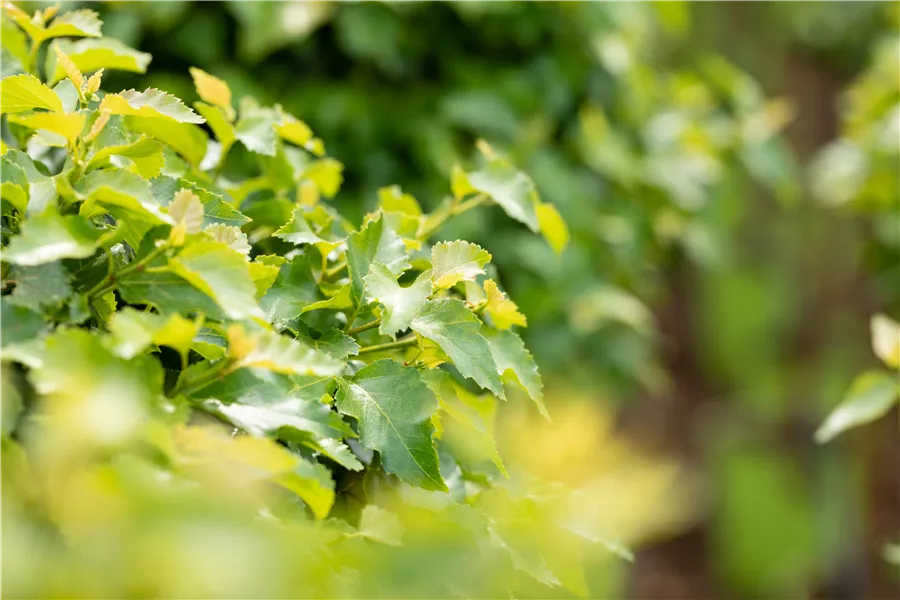 Die sommergrünen Blätter der Lollypopbirke 'Magical Globe' sind hellgrün, dreieckig, rautenförmig, wechselständig, grob gesägt. Diese sind etwa 3 - 7 cm groß. Lollypopbirke 'Magical Globe' zeigt sich leuchtend goldgelb im Herbst.