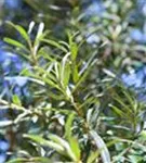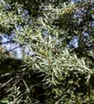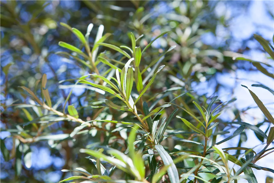 Die sommergrünen Blätter des Sanddorn, männl.s'Pollmix' sind silbrig, lanzettlich, wechselständig. Diese sind etwa 2 - 5 cm groß. Lange haftend.
