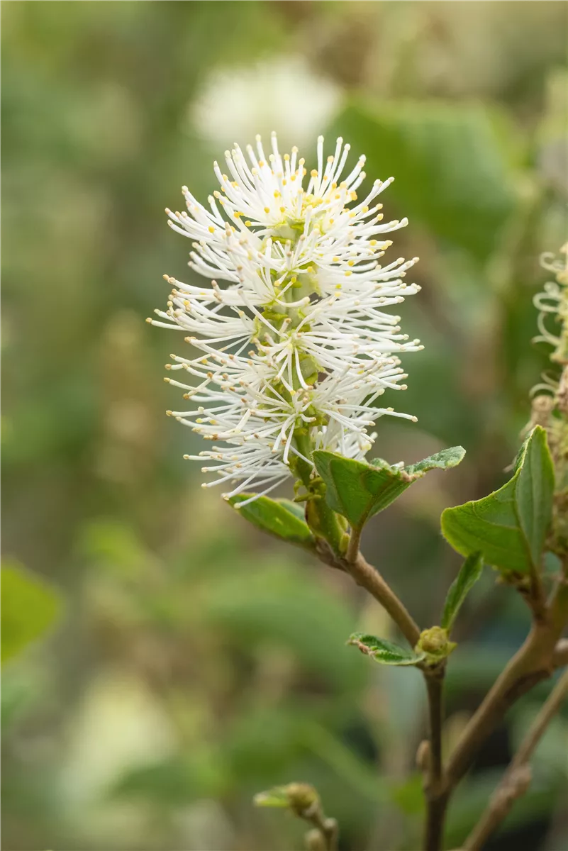 Die cremeweißen Blüten des Zwerg-Federbuschstrauch erscheinen in Ähren von April bis Mai. Diese werden etwa 2 - 4 cm groß und sind stark duftend.
