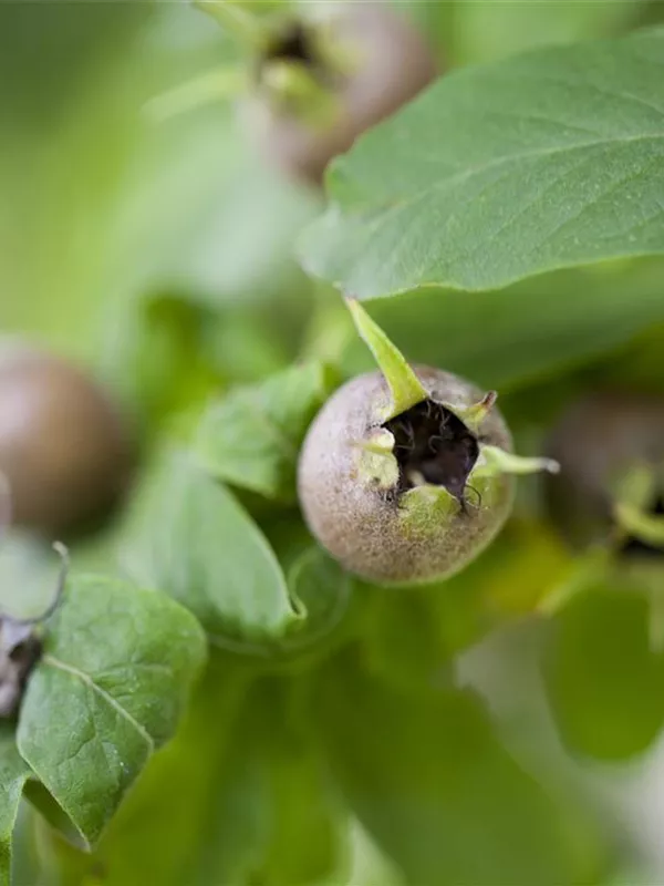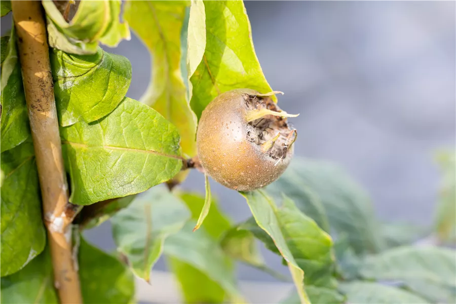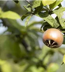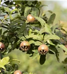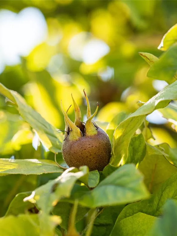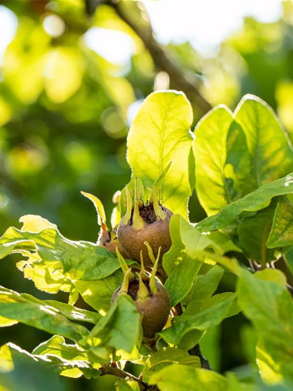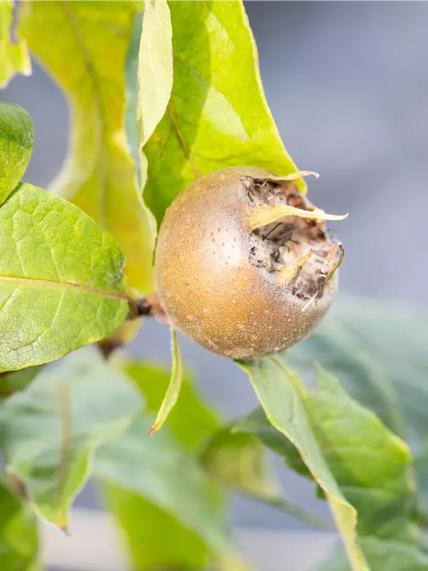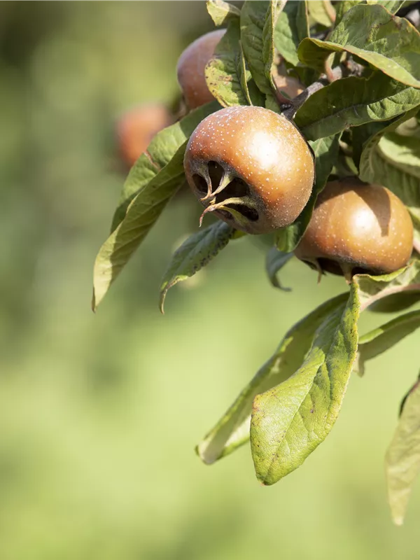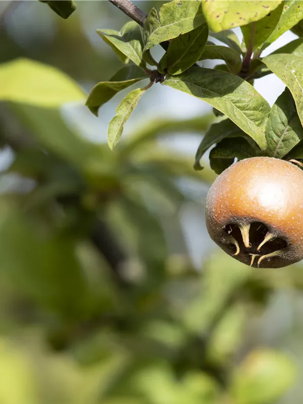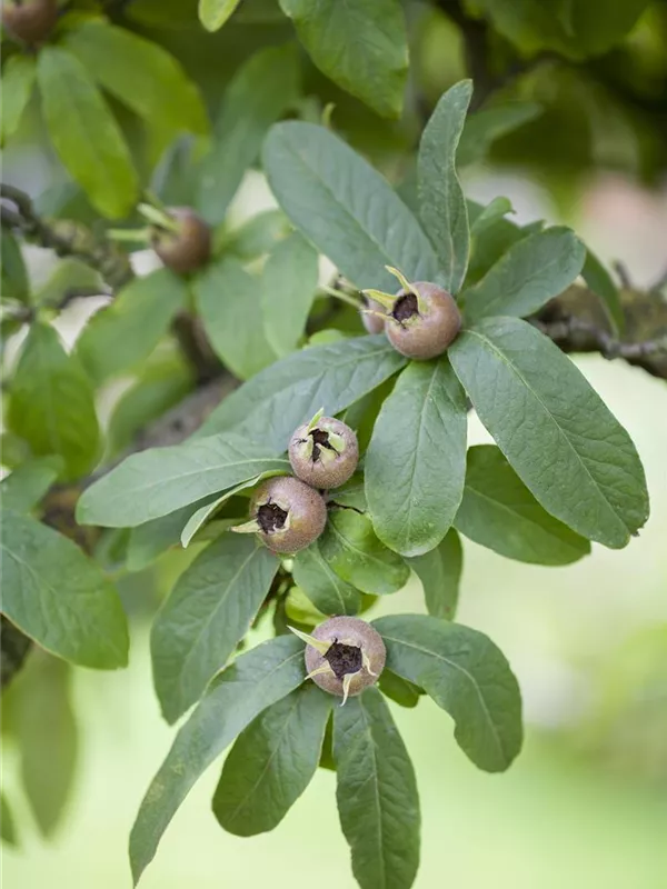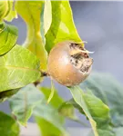 Mespilus germanica bildet braune Früchte mit einem süßen, nussigen Geschmack. Die Fruchtschale dieser flachen Früchte ist rau. Reifezeit ab November.