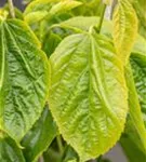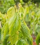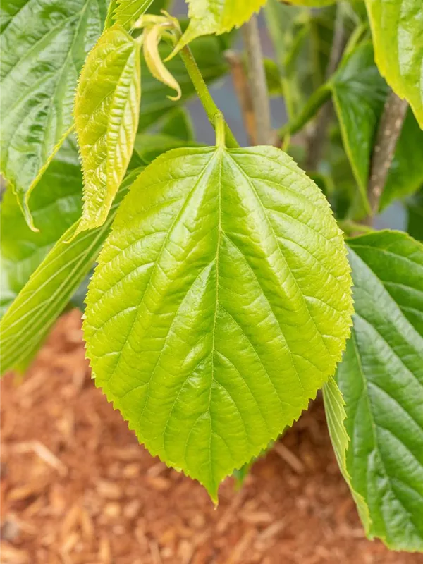 Die sommergrünen Blätter des Maulbeerbaums 'Giant Fruit' sind dunkelgrün, herzförmig, wechselständig.