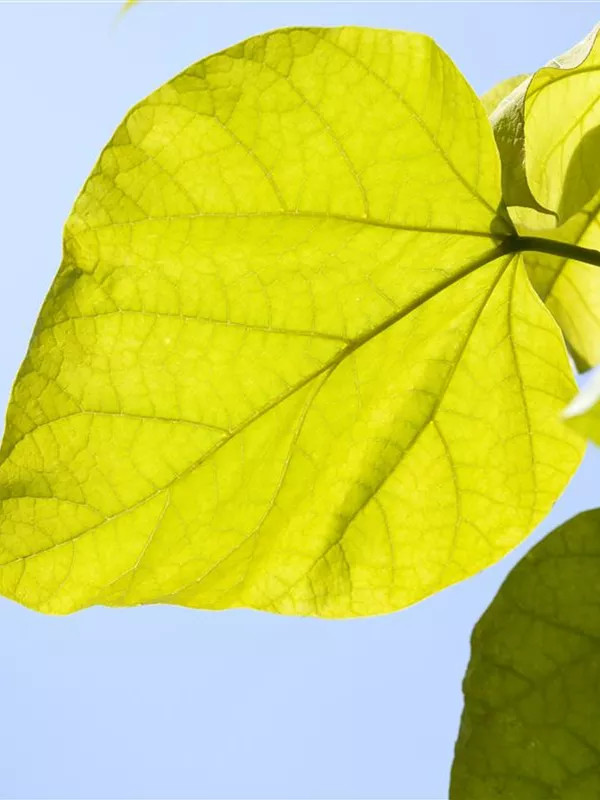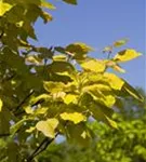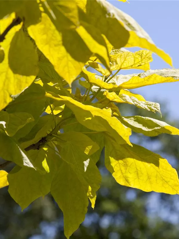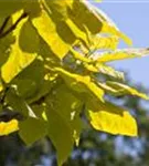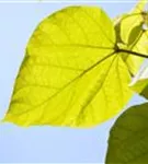 Die sommergrünen Blätter des Trompetenbaums sind mittelgrün, herzförmig, gegenständig. Diese sind etwa 10 - 20 cm groß. Trompetenbaum zeigt sich leuchtend gelb im Herbst.