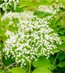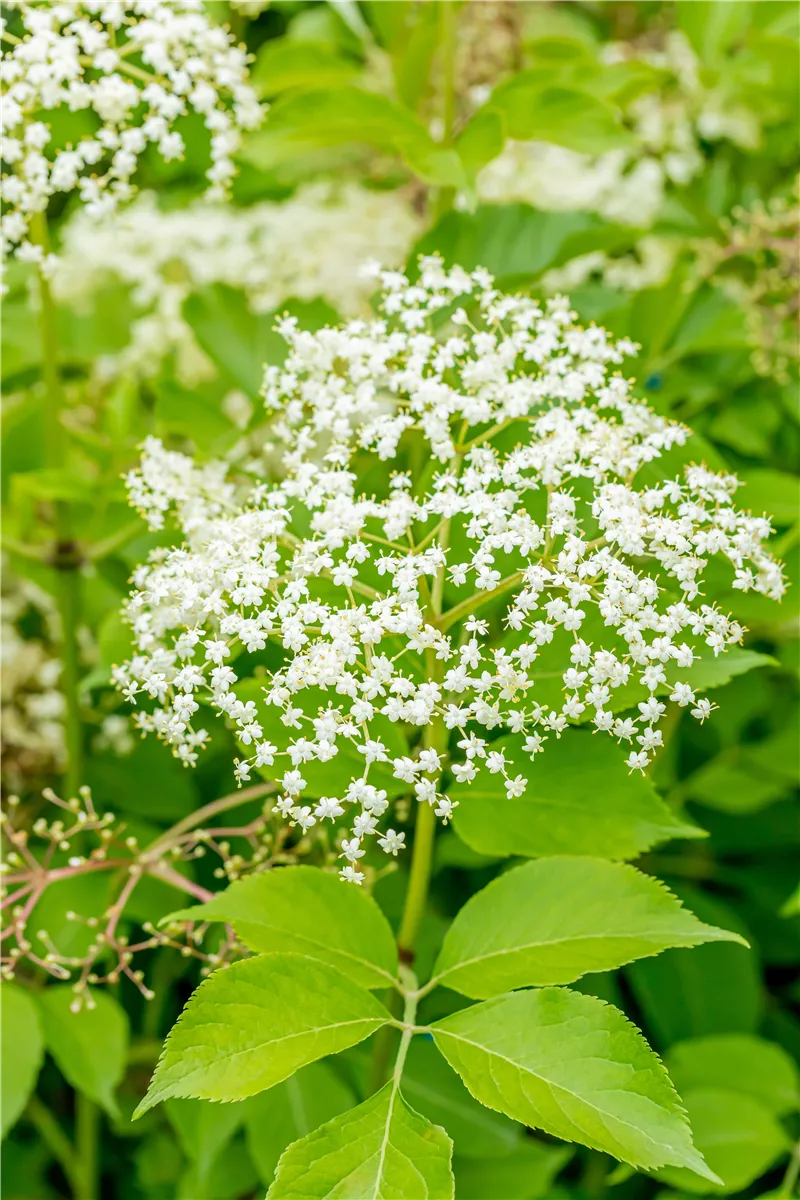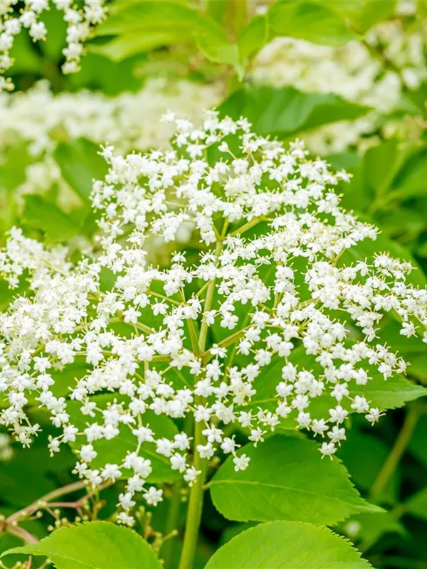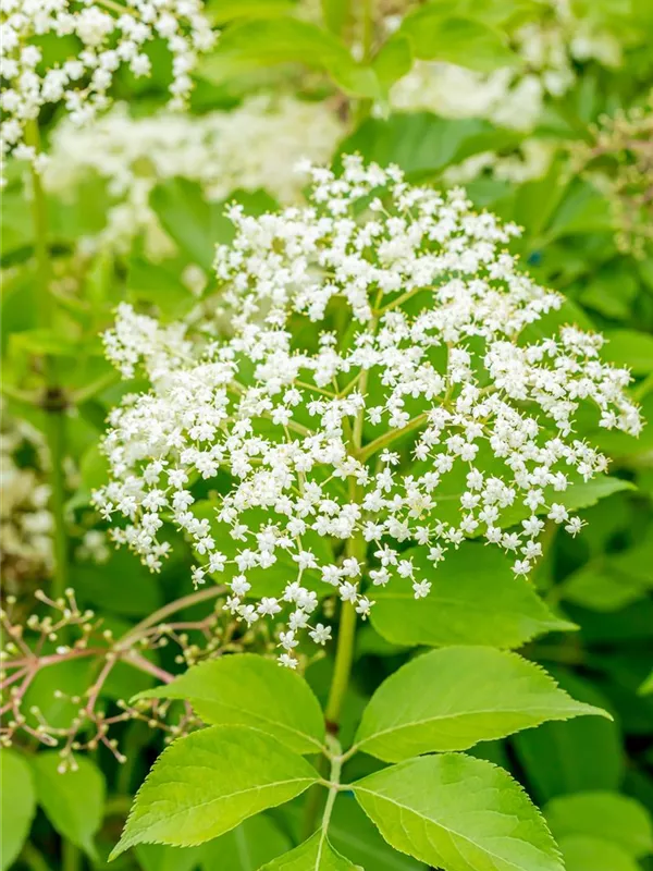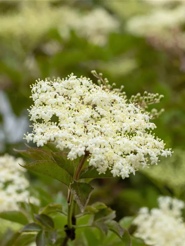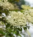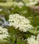 Die cremeweißen Blüten des Schwarzen Holunder 'Haschberg' erscheinen in Schirmtrauben von Juni bis Juli. Diese sind leicht duftend.