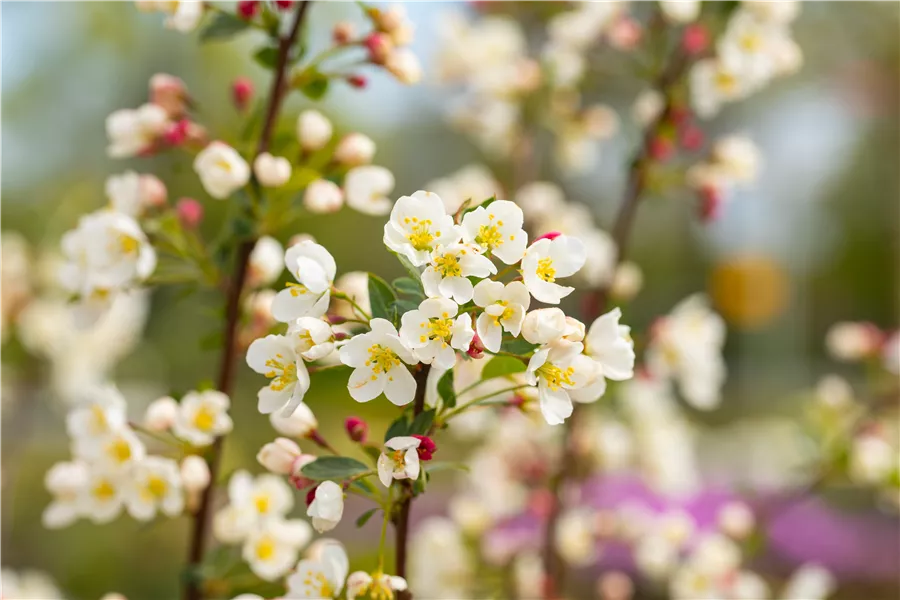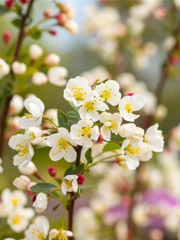 Besonders dekorativ sind die dunkelroten, runden Früchte von Malus sargentii 'Tina'. Diese erscheinen ab Juli.