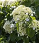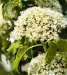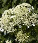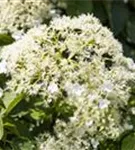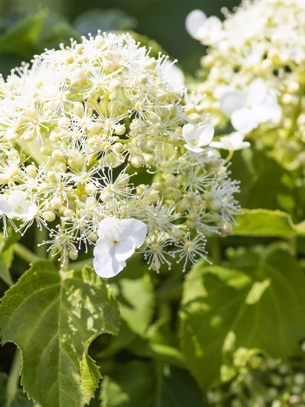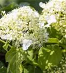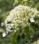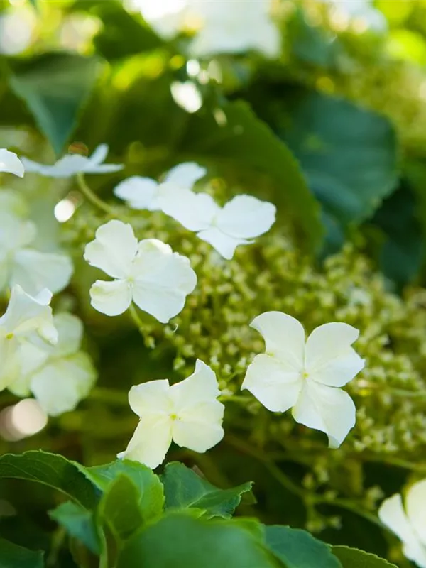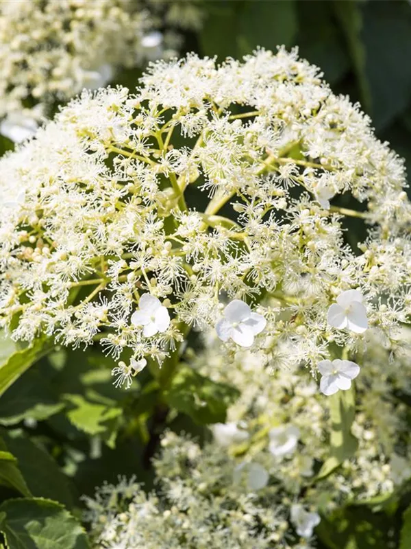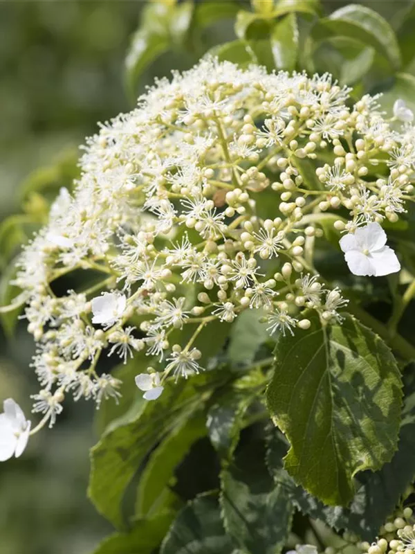 Die weißen Blüten der Kletterhortensie erscheinen in Rispen von Juni bis Juli. Diese sind angenehm duftend.