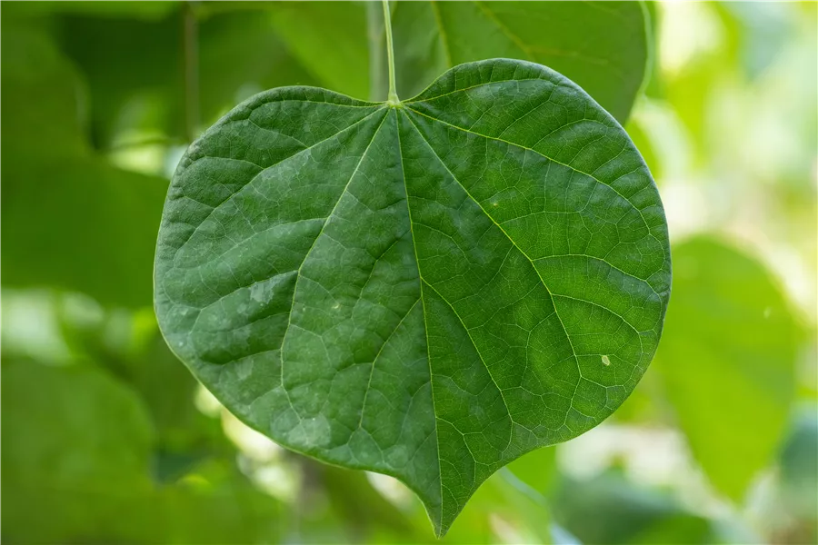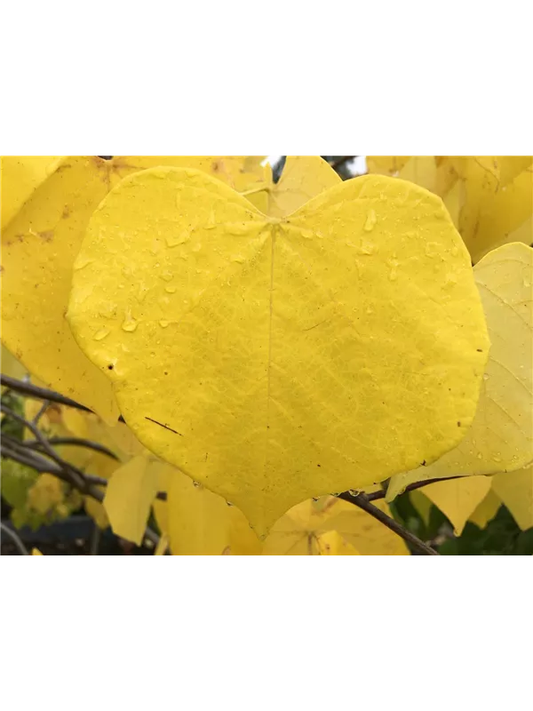 Die sommergrünen Blätter des Judasbaums 'Vanilla Twist' sind mittelgrün, herzförmig, wechselständig. Diese sind etwa 8 - 14 cm groß.