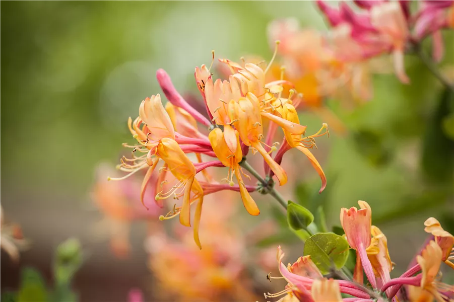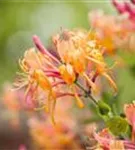 Die gelb-roten, röhrenförmigen Blüten erscheinen von Juni bis Juli. Diese sind angenehm duftend.