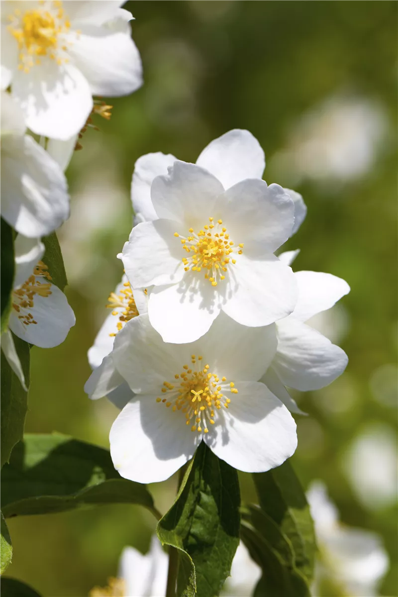Die weißen, starkgefüllten, schalenförmigen Blüten des Duftjasmin 'Erectus' erscheinen in Trauben von Juni bis Juli. Diese sind stark duftend.