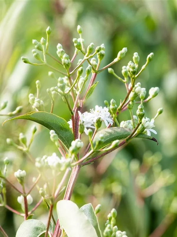 Die cremeweißen Blüten des Sieben-Söhne-des-Himmels-Strauch erscheinen in Rispen von August bis September. Diese sind stark duftend.
