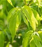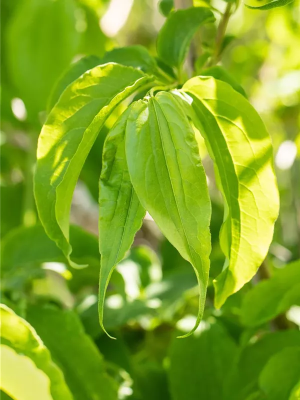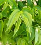 Die sommergrünen Blätter des Sieben-Söhne-des-Himmels-Strauchs sind dunkelgrün, eiförmig, gegenständig. Diese sind etwa 7 - 10 cm groß. Lange haftend.