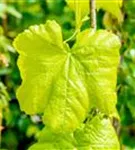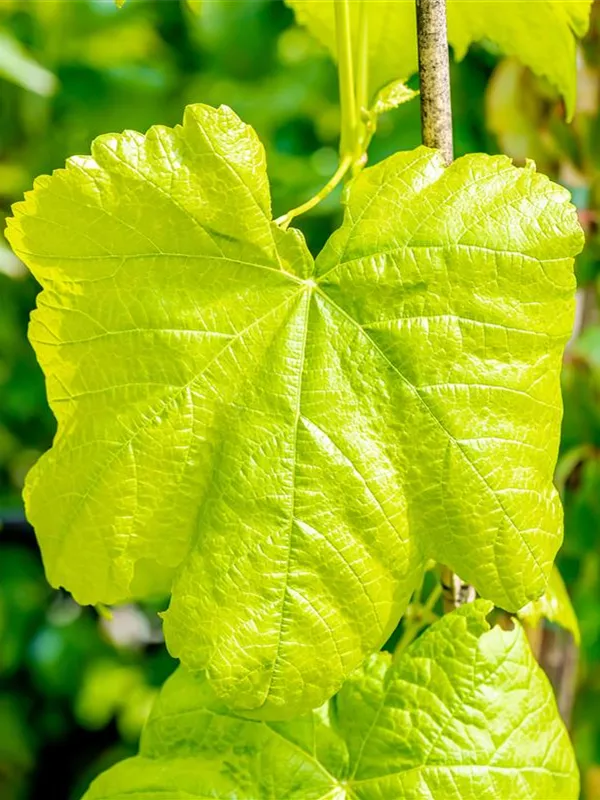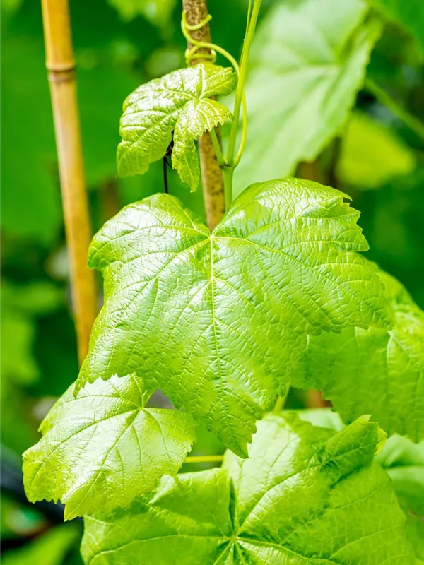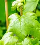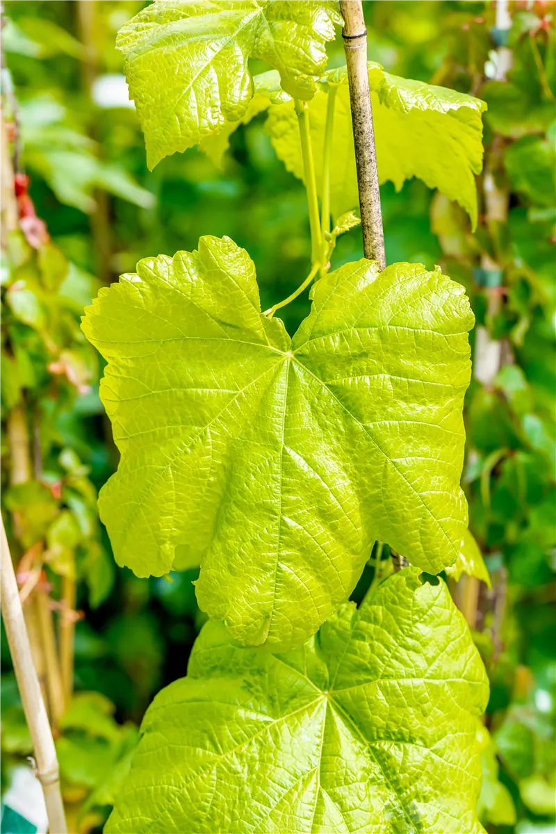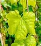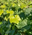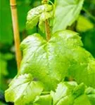 Die sommergrünen Blätter der Tafeltraube 'Romulus' sind dunkelgrün, herzförmig, gezähnt. Tafeltraube 'Romulus' zeigt sich leuchtend kupfergelb bis rot im Herbst.