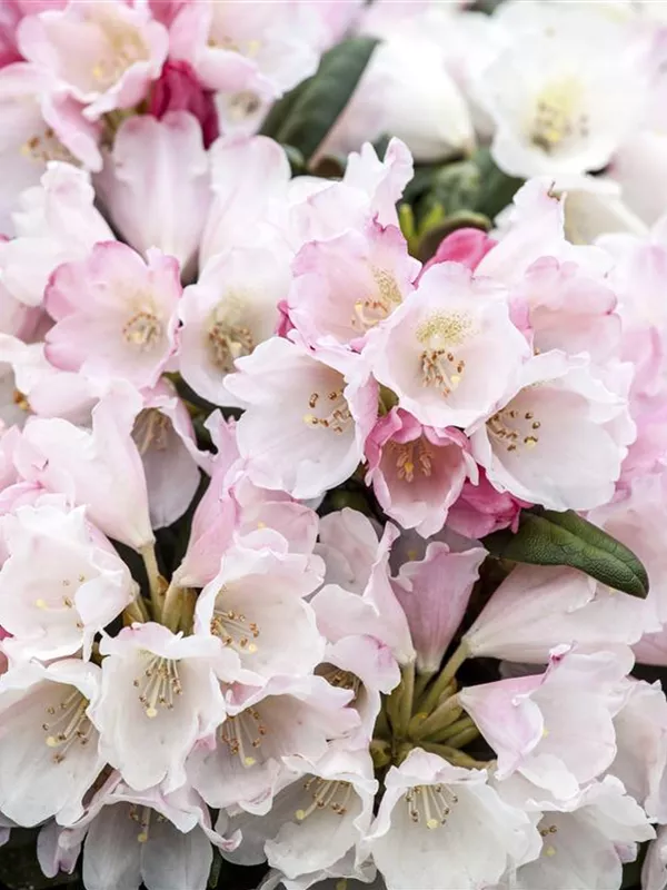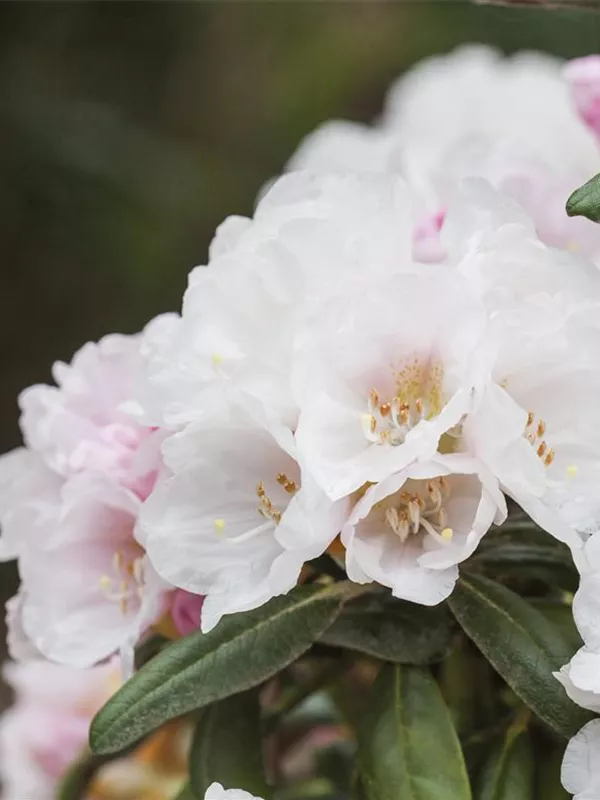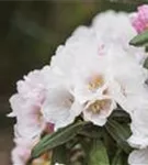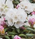 Rhododendron yakushimanum 'Koichiro Wada' bildet von Mitte Mai bis Anfang Juni zahlreiche trichterförmige, weiße Blüten.