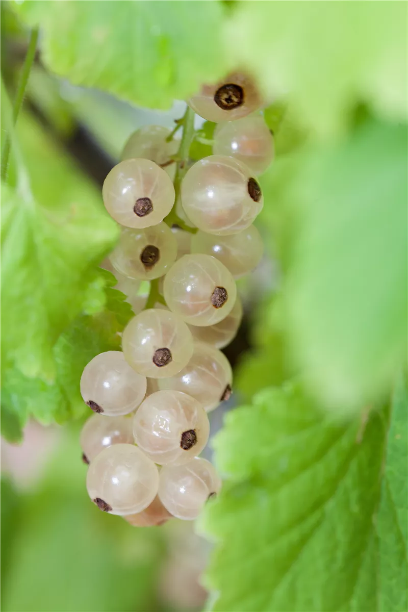Die cremeweißen Beeren haben einen säuerlichen, milden Geschmack. Reifezeit ab Juni.