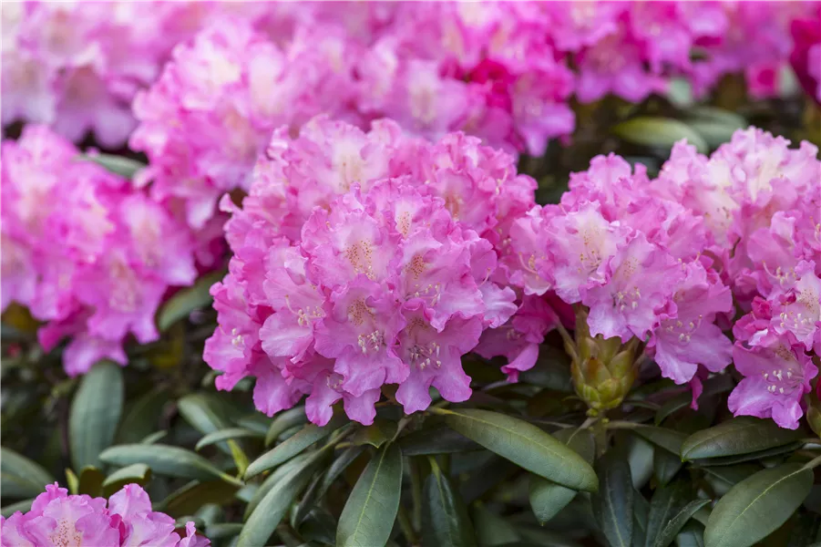 Rhododendron 'Anastasia'® bildet von Ende Mai bis Mitte Juni zahlreiche trichterförmige, in Dolden angeordnete, dunkelrosafarbene Blüten mit hellrosafarbener.