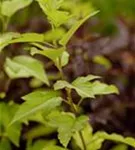 Hoher Blattschmuckwert. Die sommergrünen Blätter der Fasanenspiere 'Angel Gold'® sind gelb-grün, eiförmig, wechselständig, gelappt. Diese sind etwa 5 - 10 cm groß.