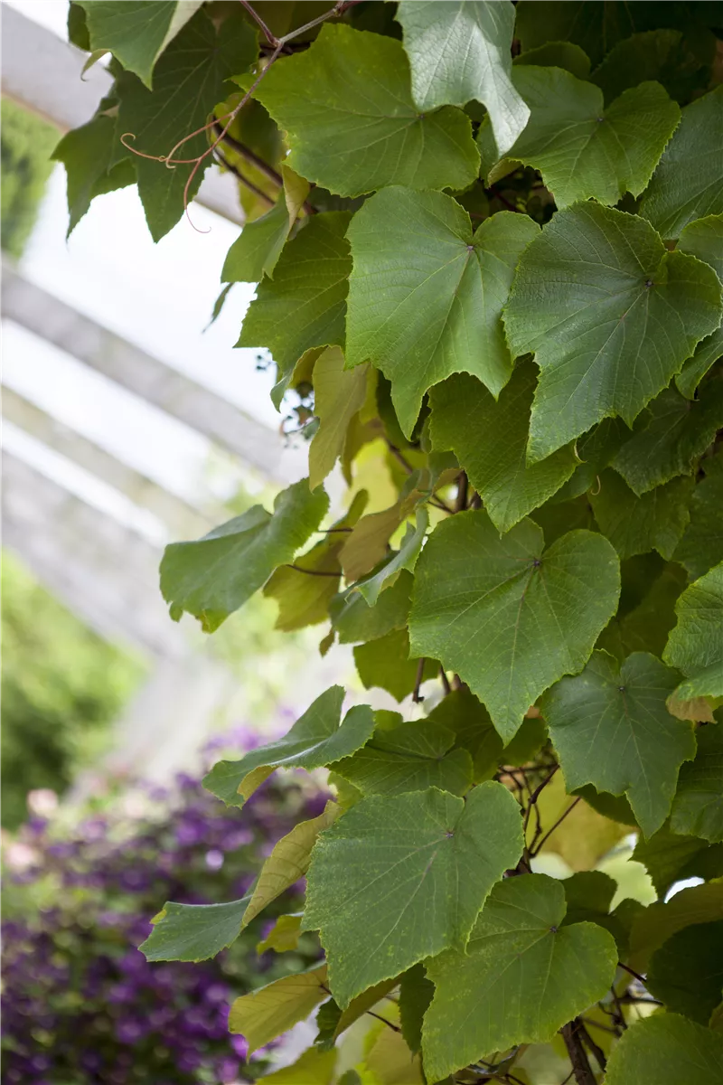 Die sommergrünen Blätter der Rostrote Rebe sind mittelgrün, herzförmig, wechselständig, gelappt. Diese sind etwa 20 - 30 cm groß. Rostrote Rebe zeigt sich leuchtend orangegelb bis rot im Herbst.