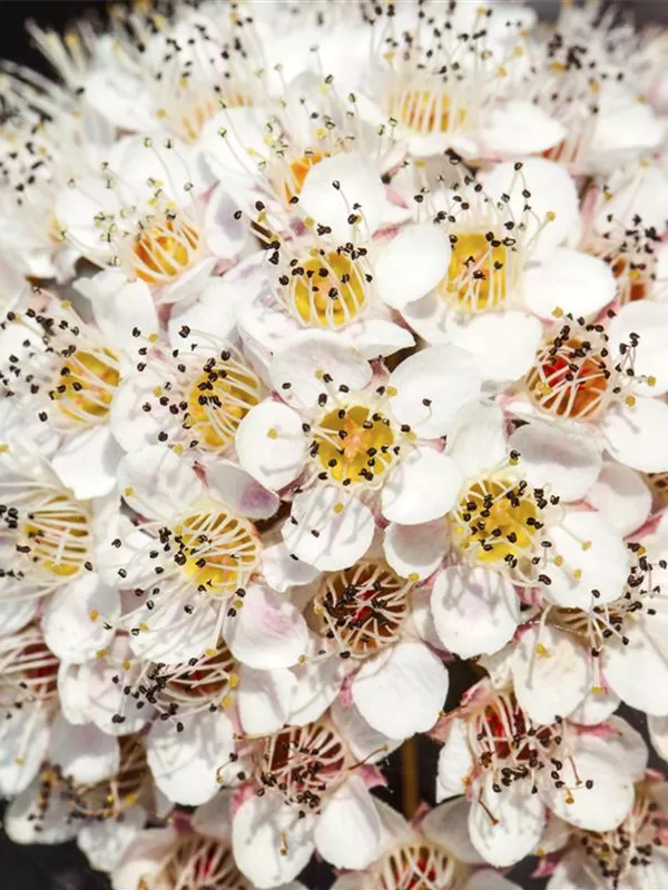 Die weißen Blüten der Fasanenspiere 'Summer Wine'® erscheinen in Doldentrauben von Juni bis Juli.