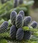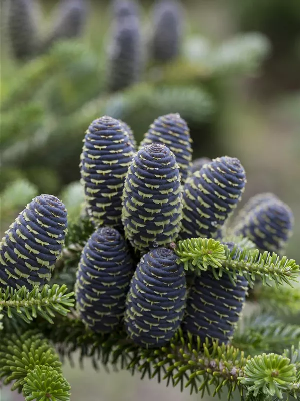 Die blauen Zapfen von Abies koreana 'Blue Emperor' stehen aufrecht und sind zylindrisch. Diese erscheinen ab Oktober.