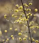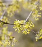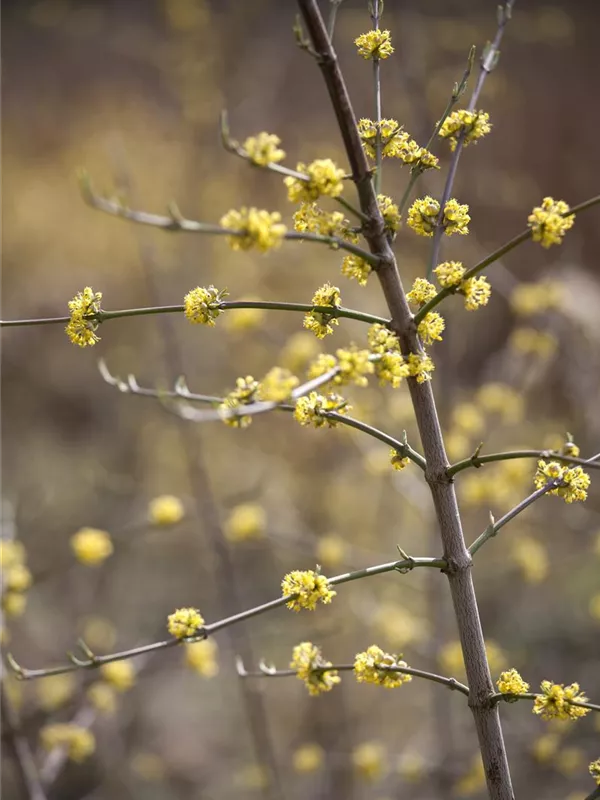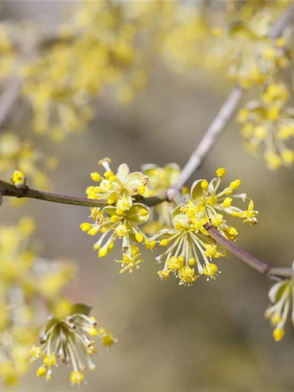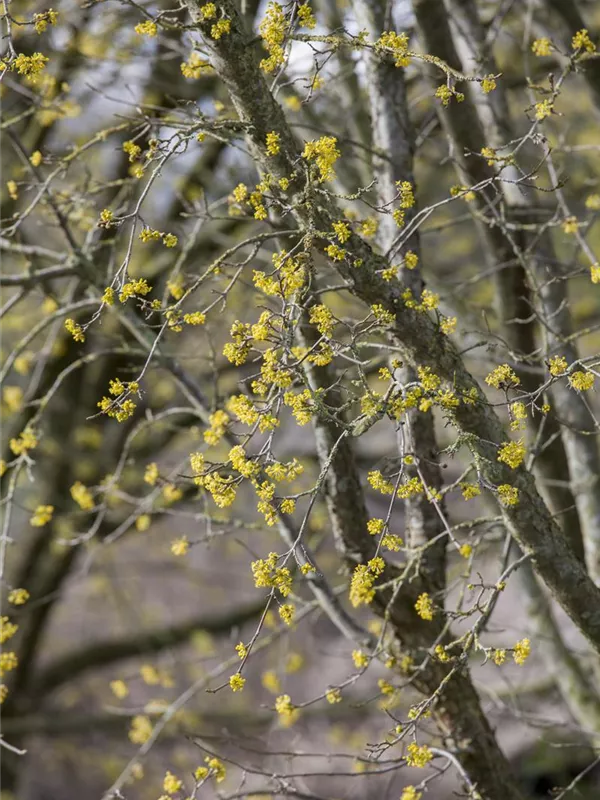 Die Kornelkirsche bildet goldgelbe, leicht duftende Blüten von März bis April. Anordnung der Blüten in schönen Dolden.